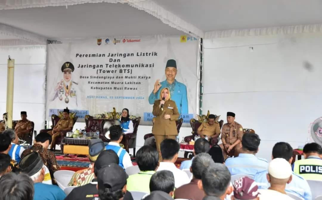 TEBARKAN.COM – MUSI RAWAS – Bupati Musi Rawas Hj. Ratna Machmud Resmikan Jaringan Listrik dan Jaringan Telekomunikasi (Tower BTS) di Desa Sindang Laya dan Mukti Karya Kecamatan Muara Lakitan, Senin (23/09/2024).