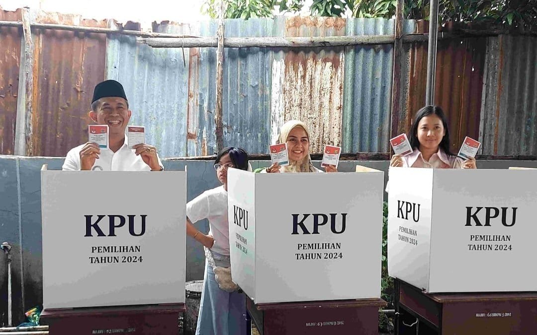 Tampak H Rodi Wijaya beserta keluarga mengambil surat suara yang kemudian melakukan pencoblosan di bilik suara, usai mencoblos kertas surat suara yang sudah dilipat diperlihatkan secara bersama-sama, sambil tersenyum ciri khasnya yang lembut dan santun.