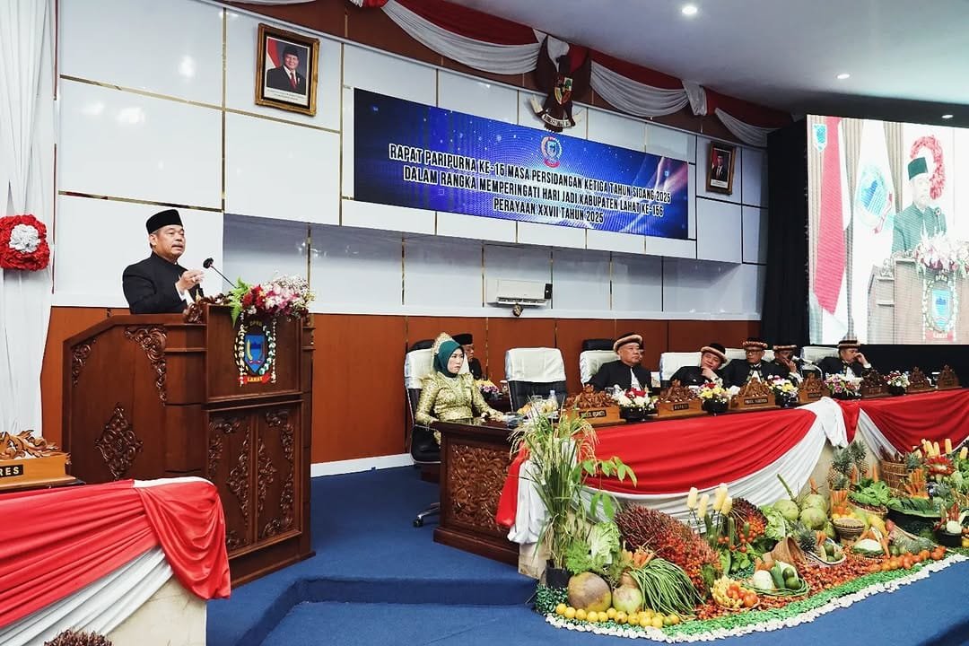 TEBARKAN – LAHAT – Dewan Perwakilan Rakyat Daerah (DPRD) Kabupaten Lahat menggelar Rapat Paripurna ke 16 masa persidangan ke tiga tahun 2025 dalam rangka memperingati hari jadi Kabupaten Lahat ke-156 perayaan ke-XXVII berlangsung di ruang sidang utama DPRD Kabupaten Lahat, Selasa (20/5/2025), yang dihadiri langsung Gubernur Sumatera Selatan H. Herman Deru dan Wakil H.Cik Ujang.