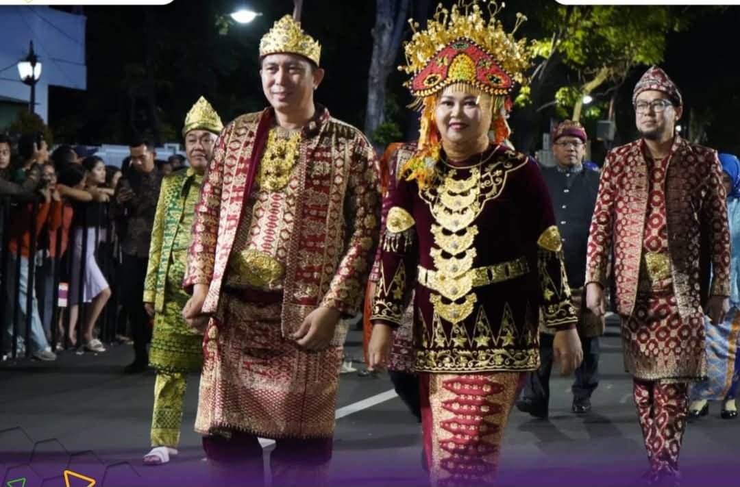 TEBARKAN – SURABAYA– Wali Kota Pagar Alam Ludi Oliansyah bersama Ketua TP PKK Kota Pagar Alam Hera Parianti Ludi memimpin barisan Delegasi Kota Pagar Alam pada acara puncak Munas ke-VII APEKSI Tahun 2025, yaitu Karnaval Budaya, yang berlangsung di Pusat Kota Surabaya, pada Jum’at malam (09/05/2025).
